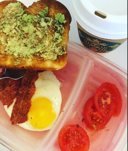 A fresh made clean breakfast of avocado toast, turkey bacon, sliced toms, and a sunny side up egg. Oh and a cup of Starbucks Blonde roast, cream and sugar on the side, thank ya.